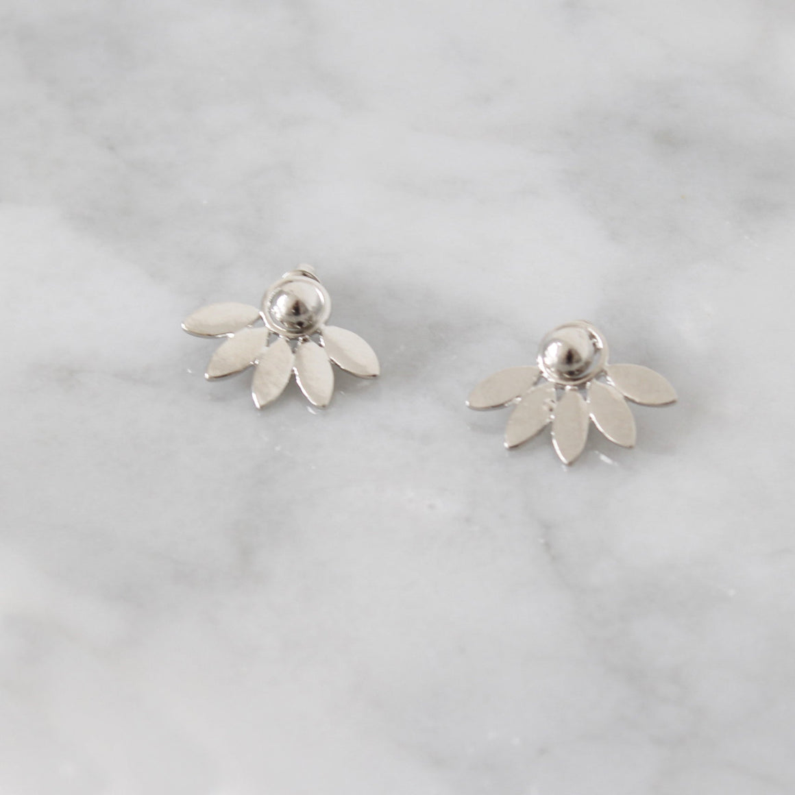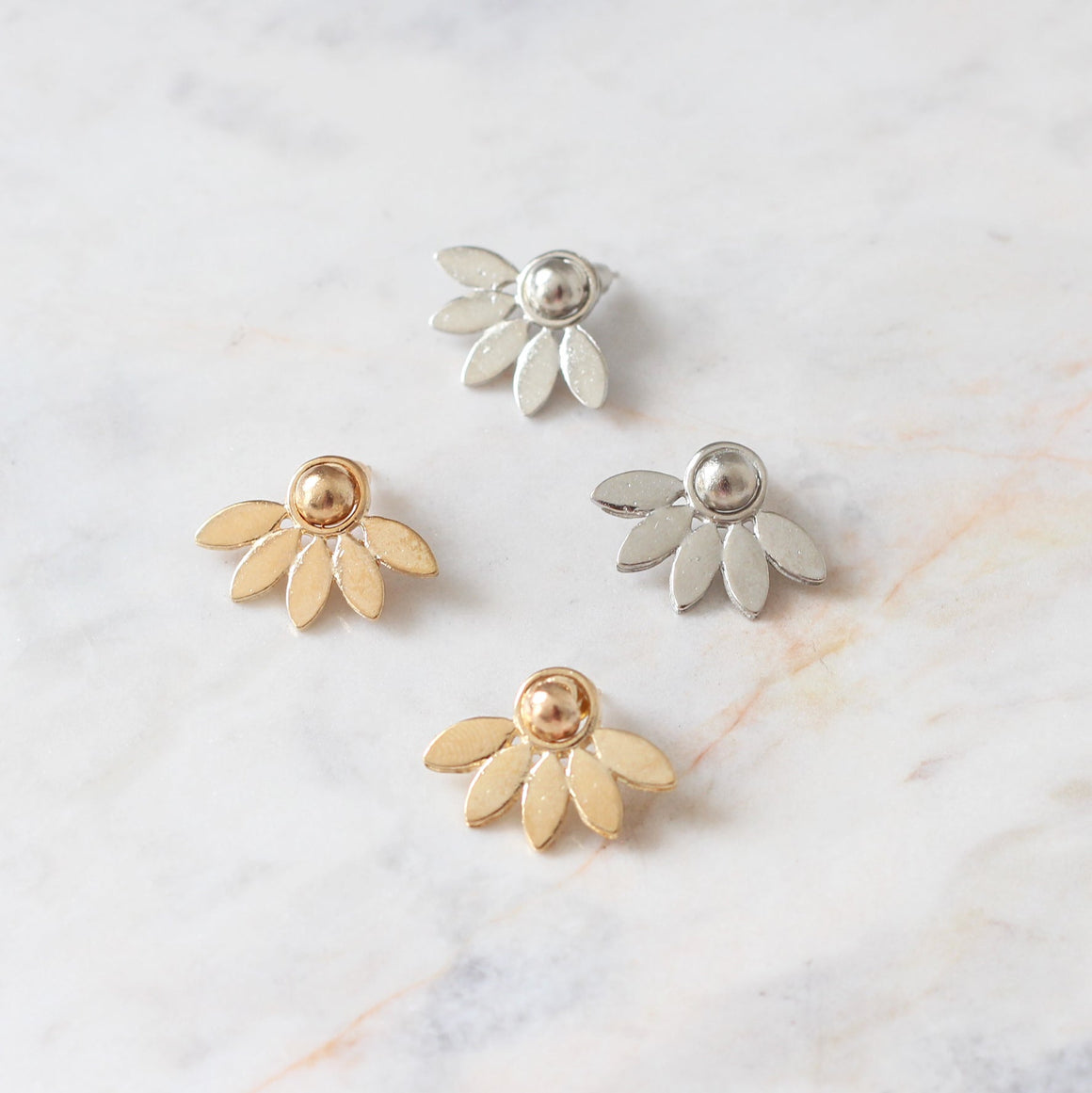 Aretes con tres distintas variaciones en posición de oreja. Tono dorado y plateado. Aleación de metales.