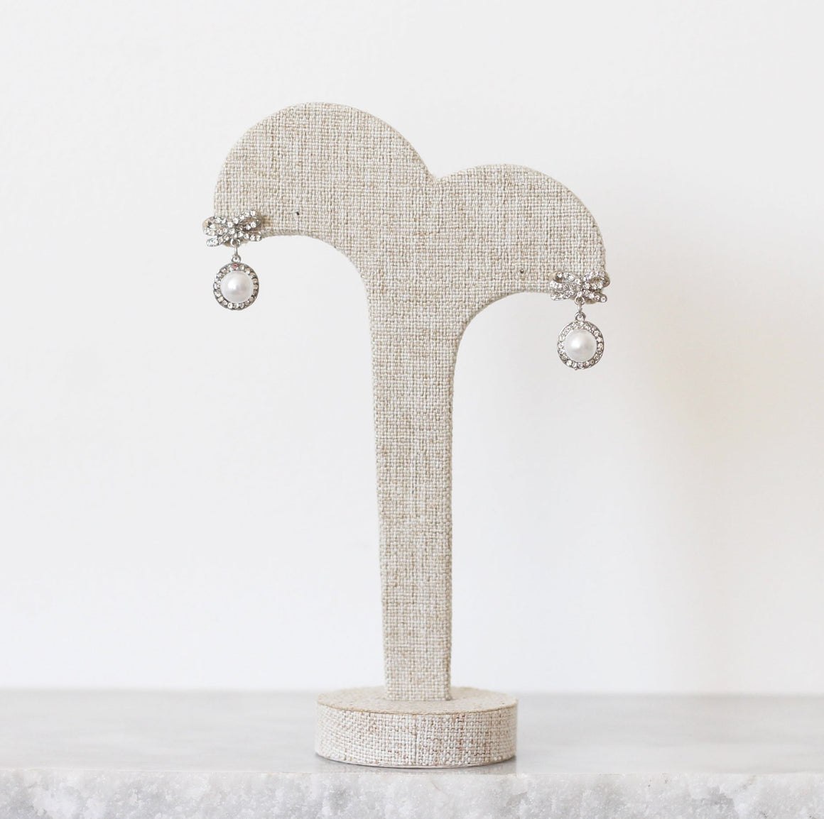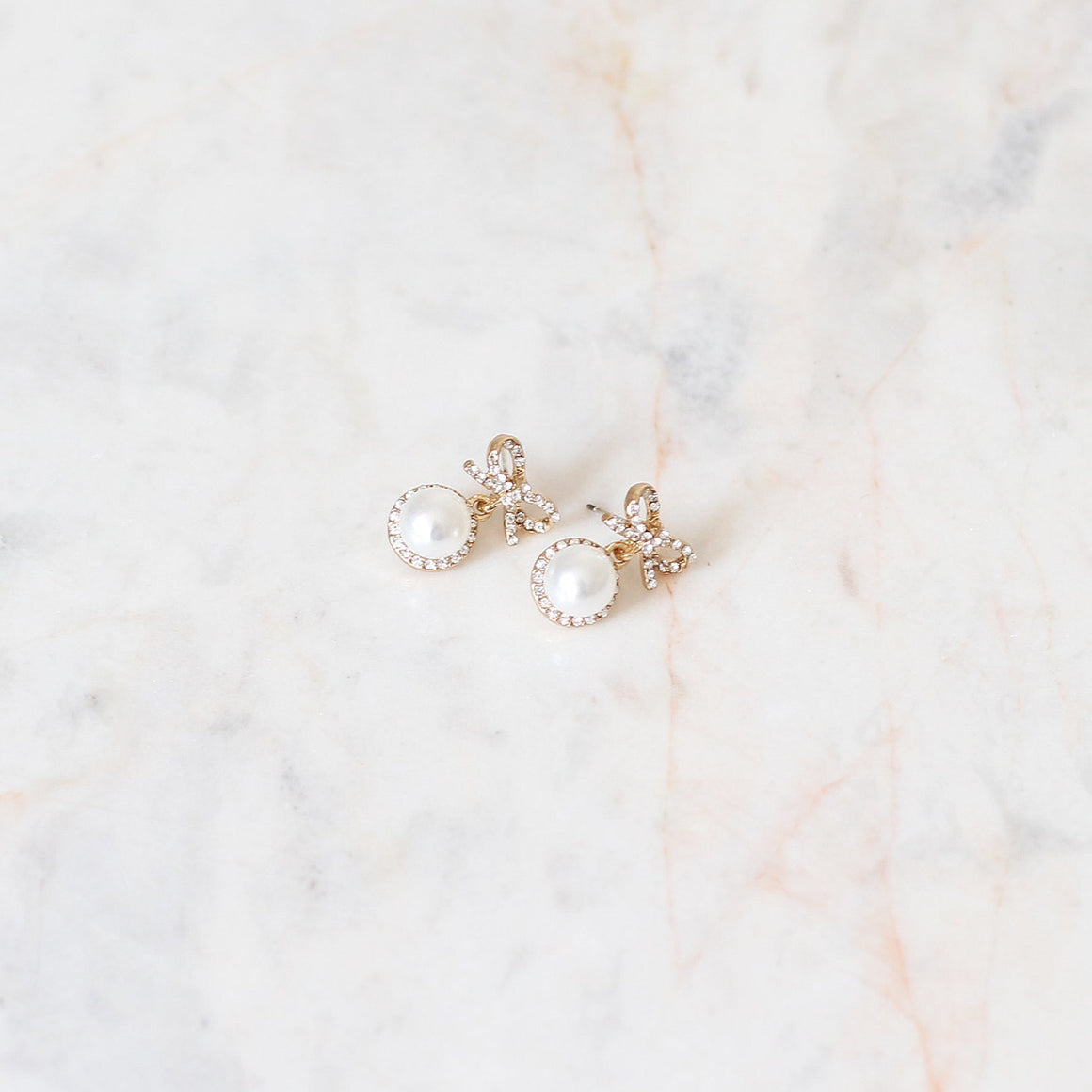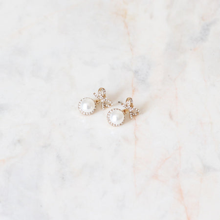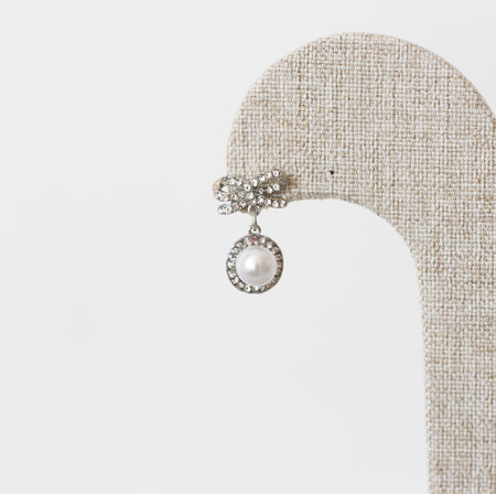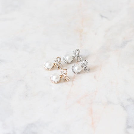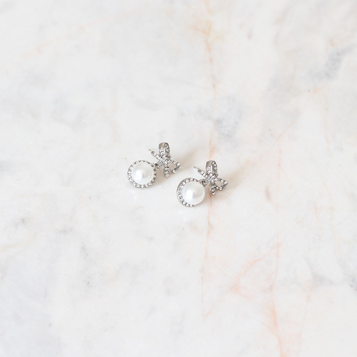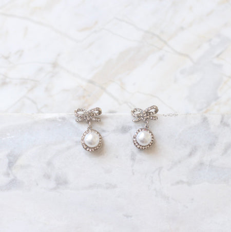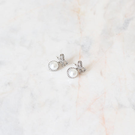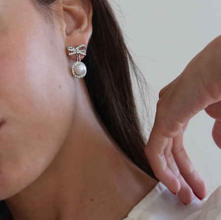 Aretes en baño de oro blanco con lazo en la parte superior y perla colgante.