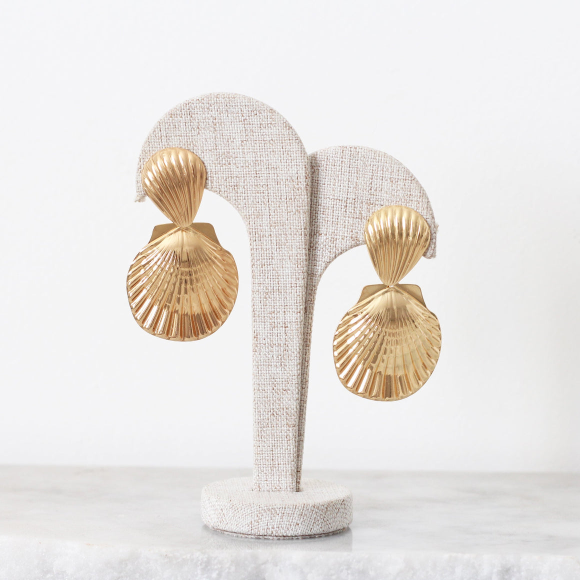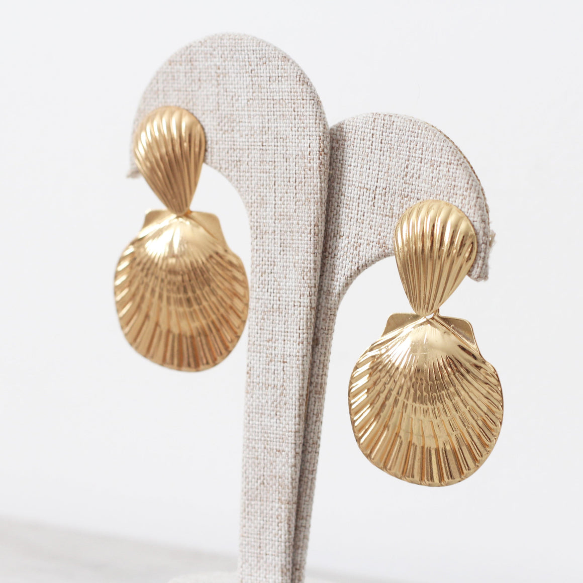 Aretes de concha en baño de oro. Broche de baño de oro 22k.