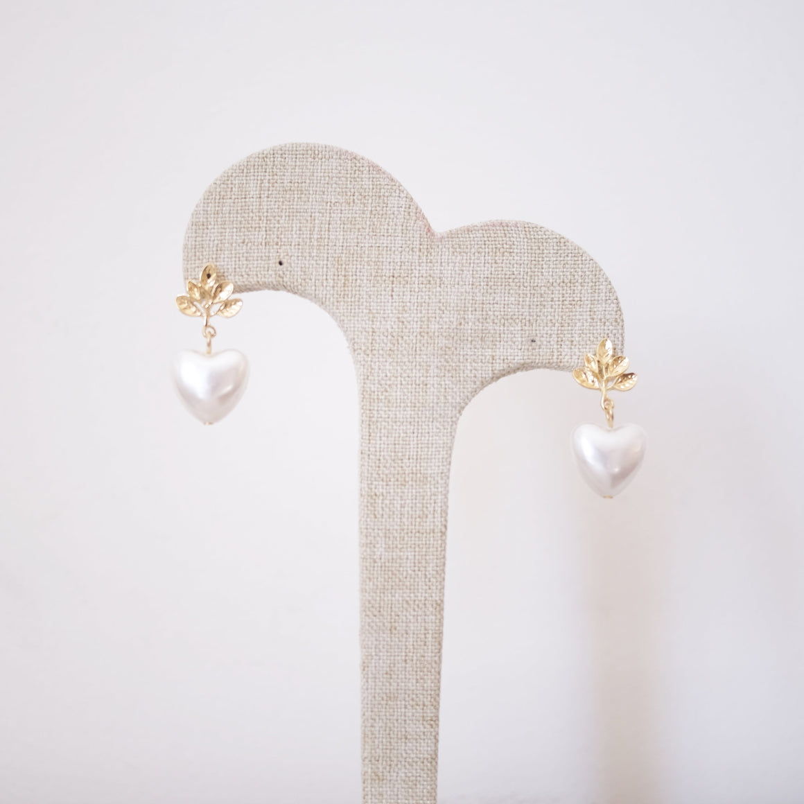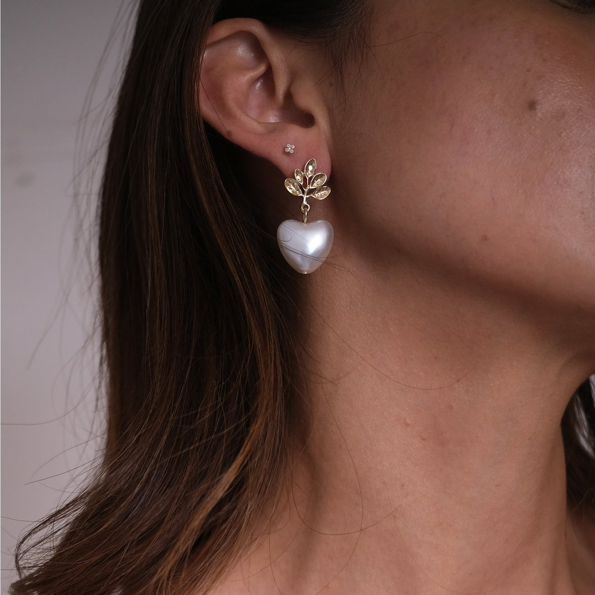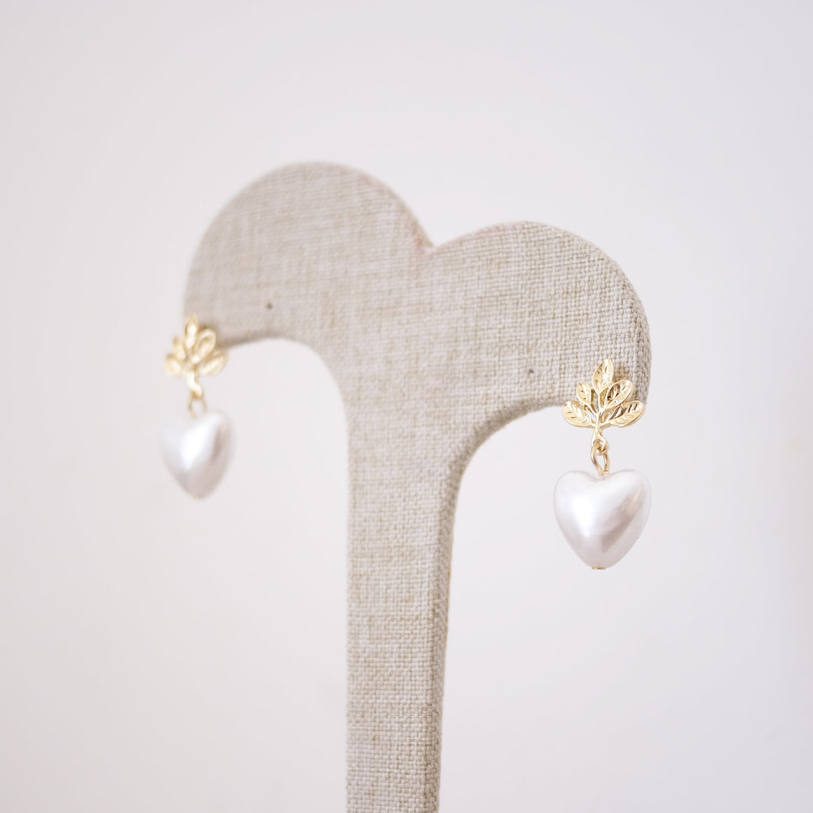 Aretes de corazón de perlas en baño de oro 22k. Largo 3 cm.
