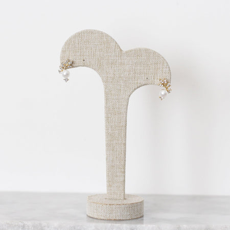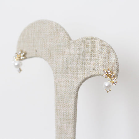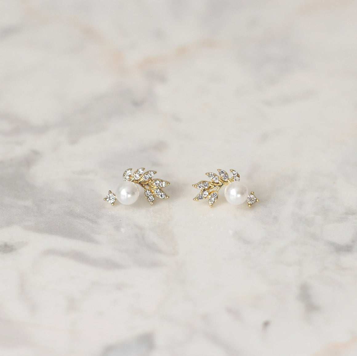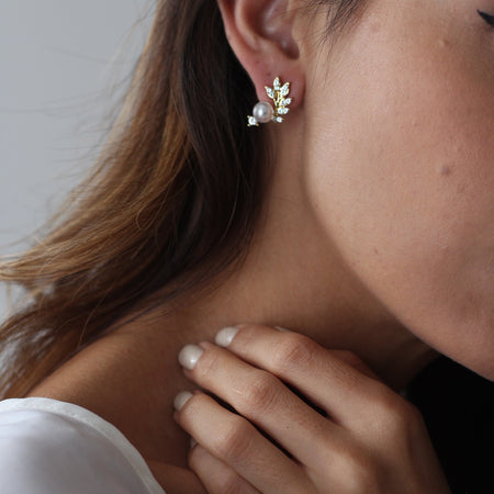 Aretes en baño de oro 22k en forma de pluma. Adornados con perla natural.