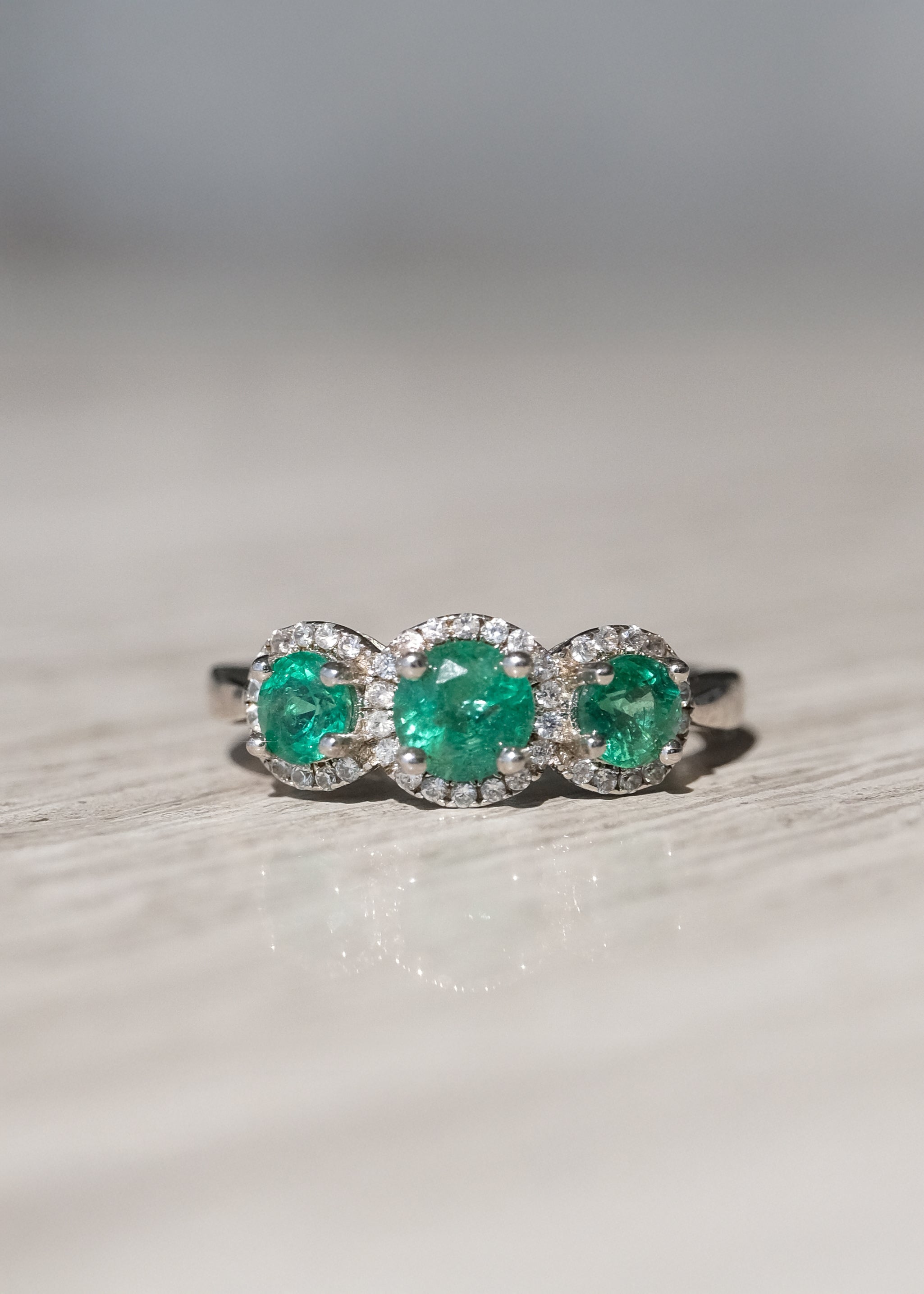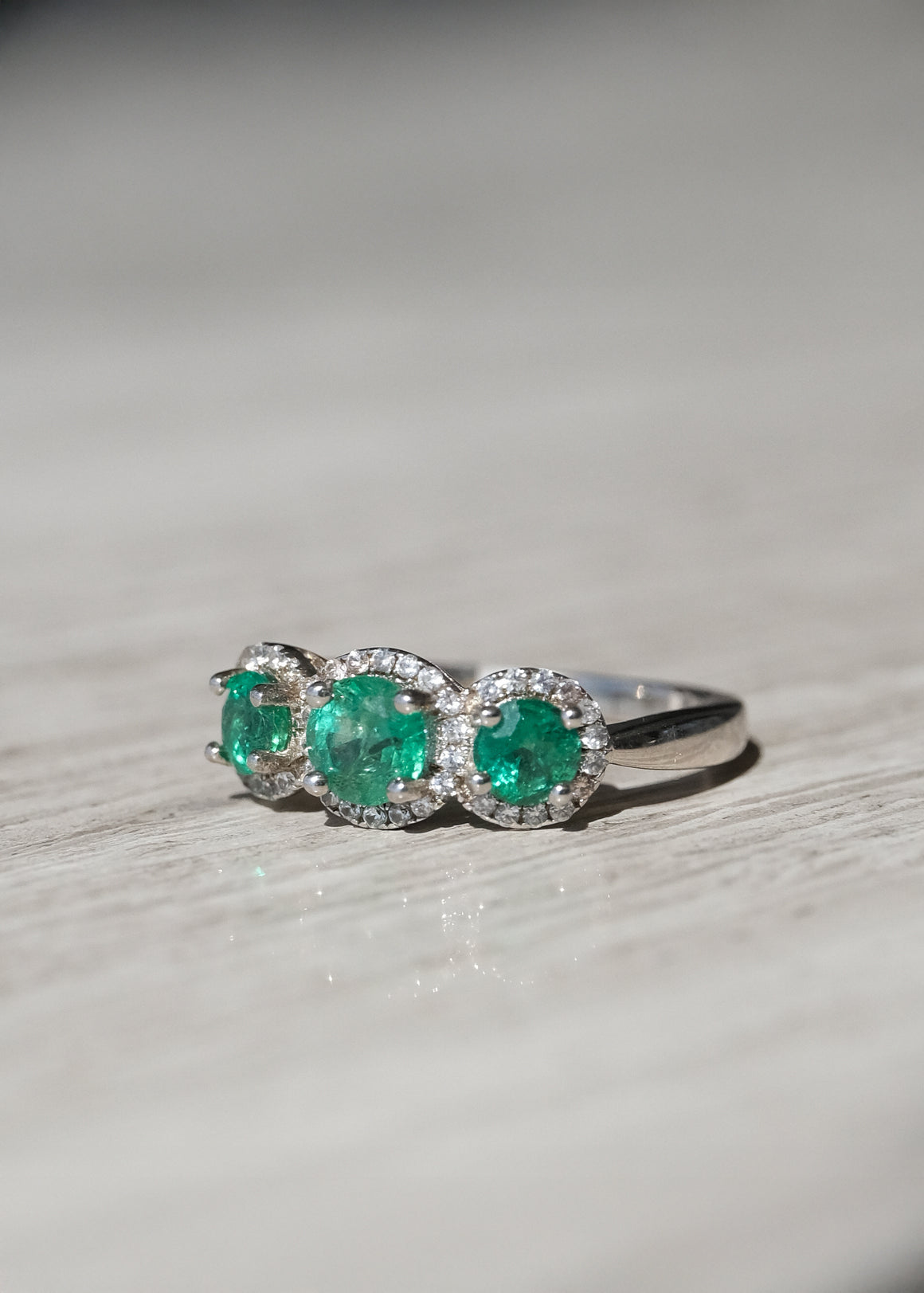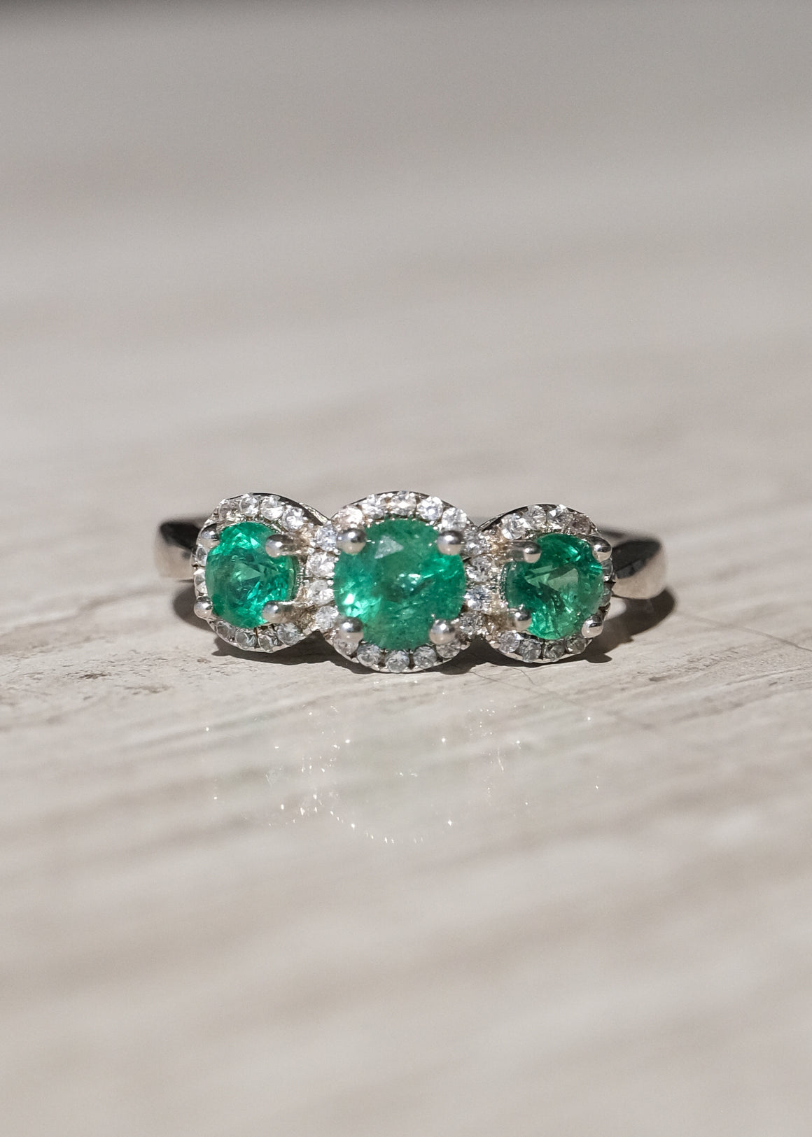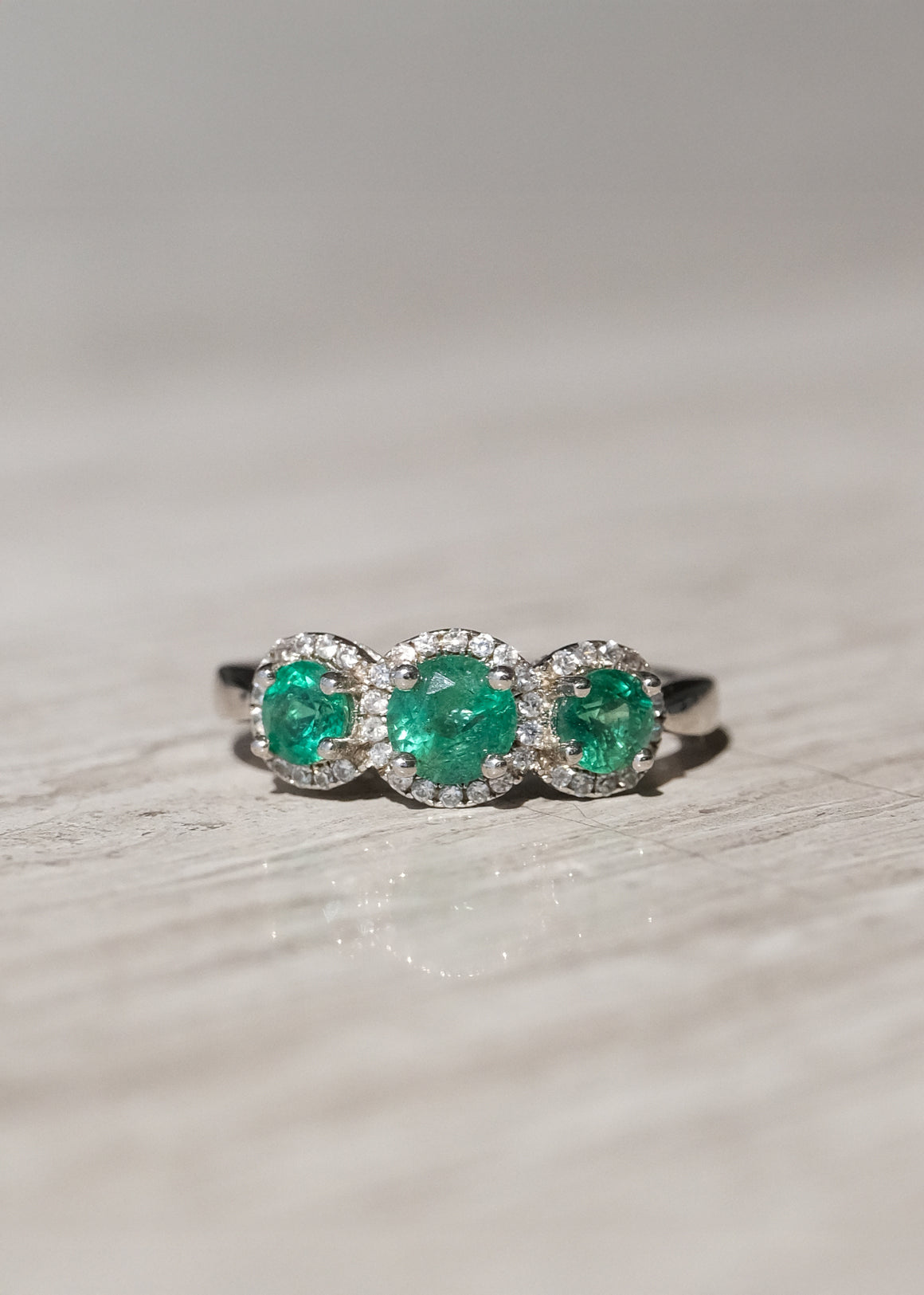 Anillo churumbela color esmeralda con 3 diamantes. Plata.
